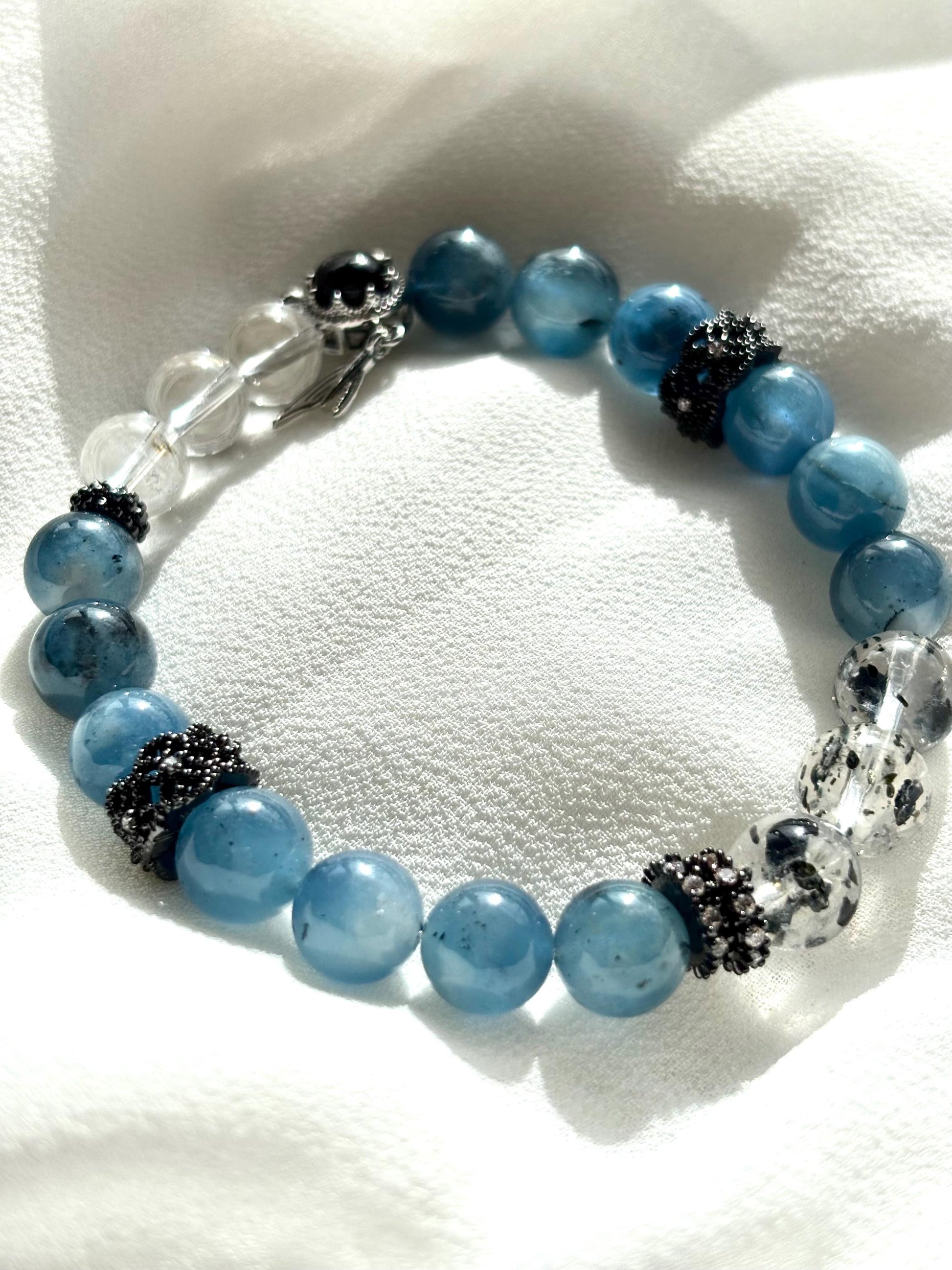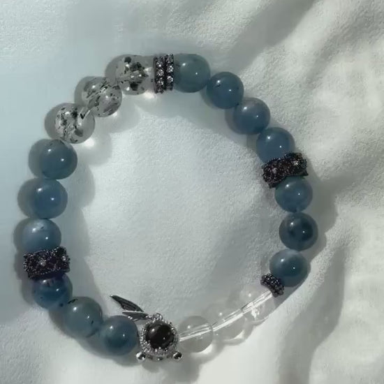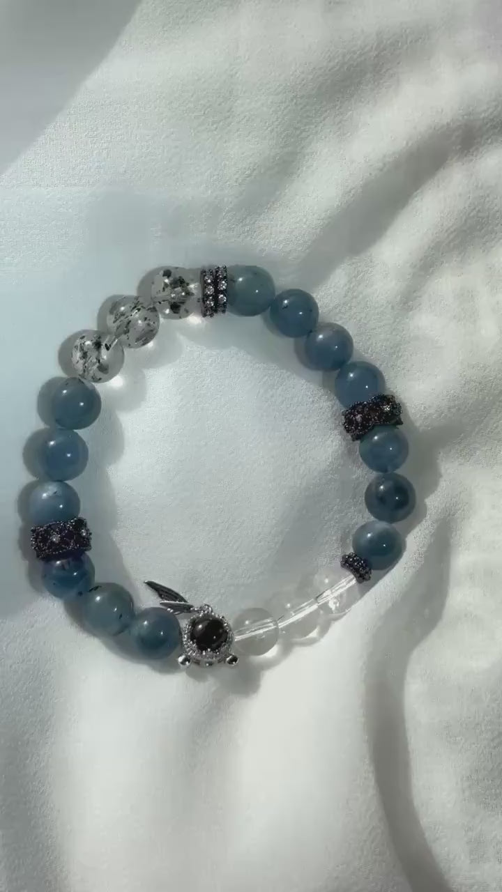 Aquamaire, Clear Quartz & Black Mica Bracelet with Gold Fish Charm – Handmade Silver Obsidian Gemstone Jewelry