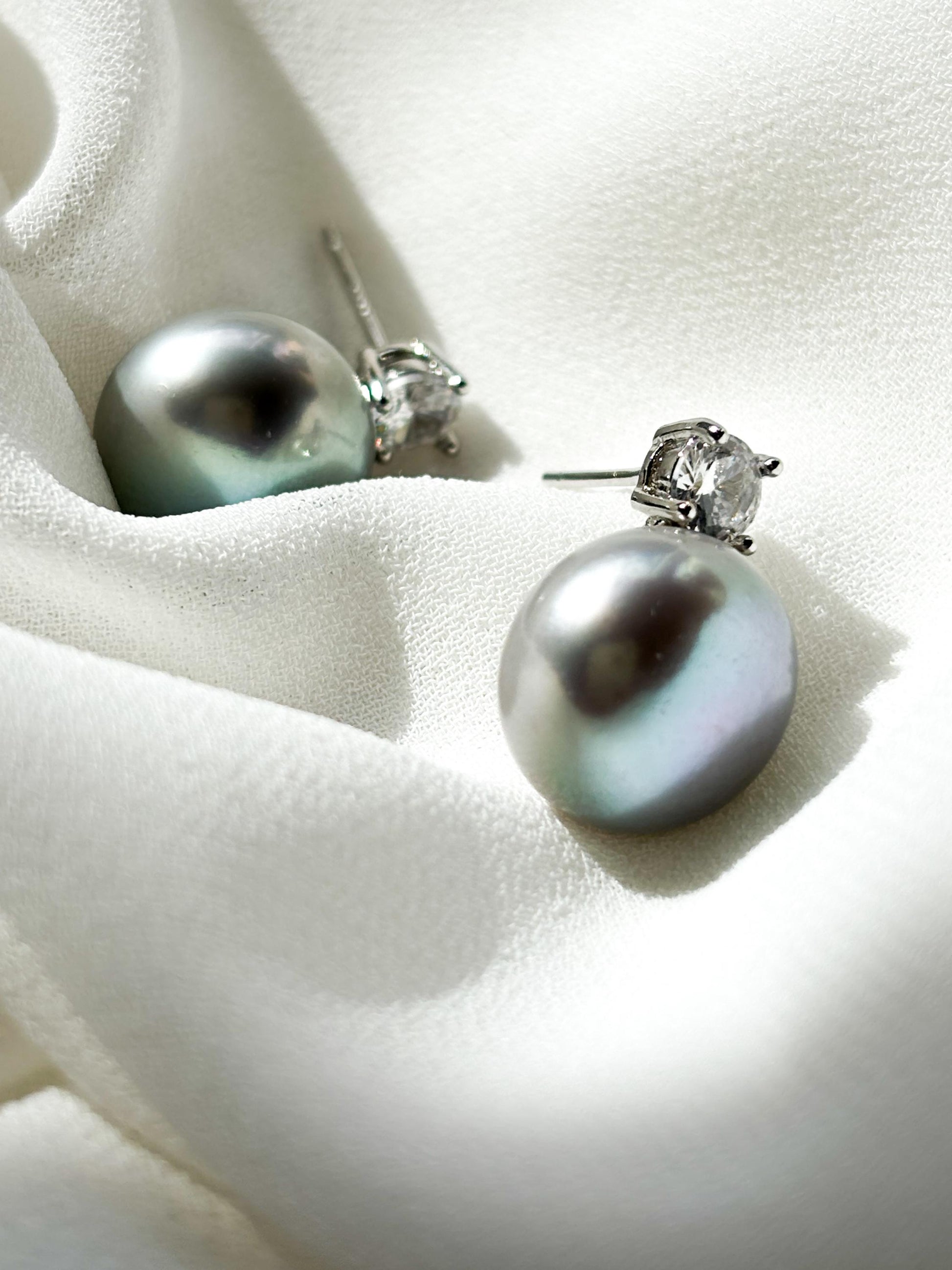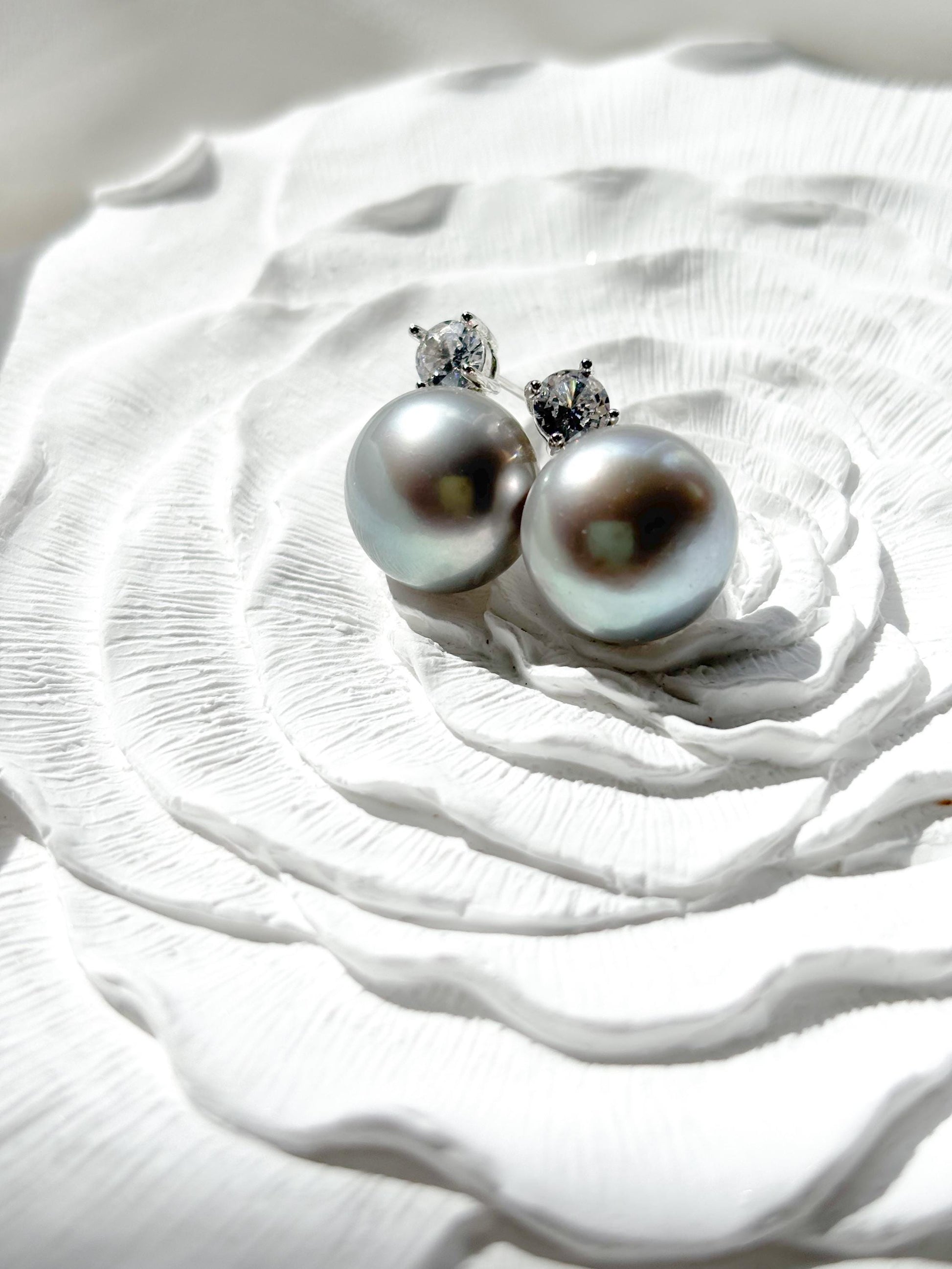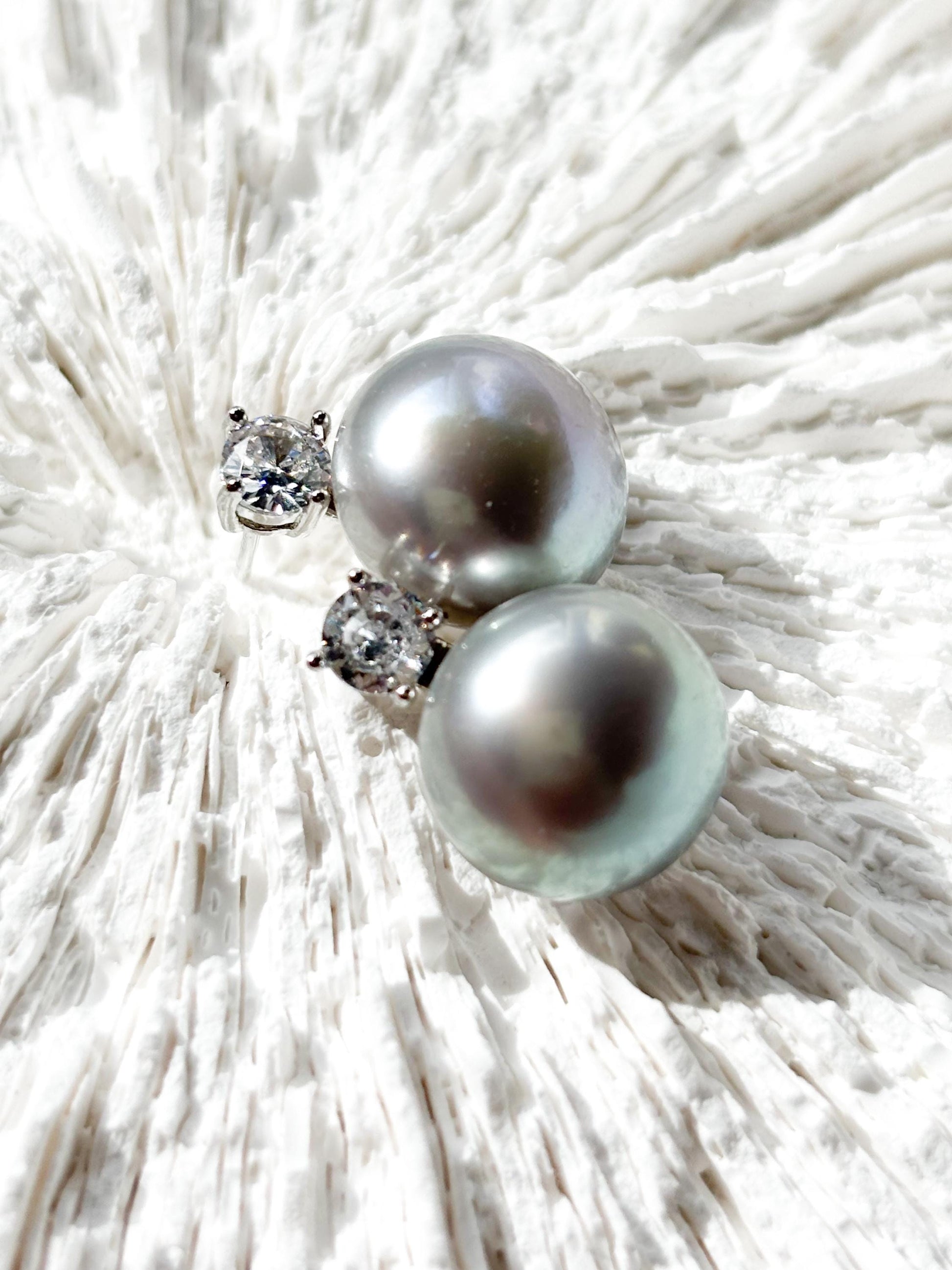 Celestial Grace – 12.5mm Grey Pearl & Moissanite Crown Stud Earrings