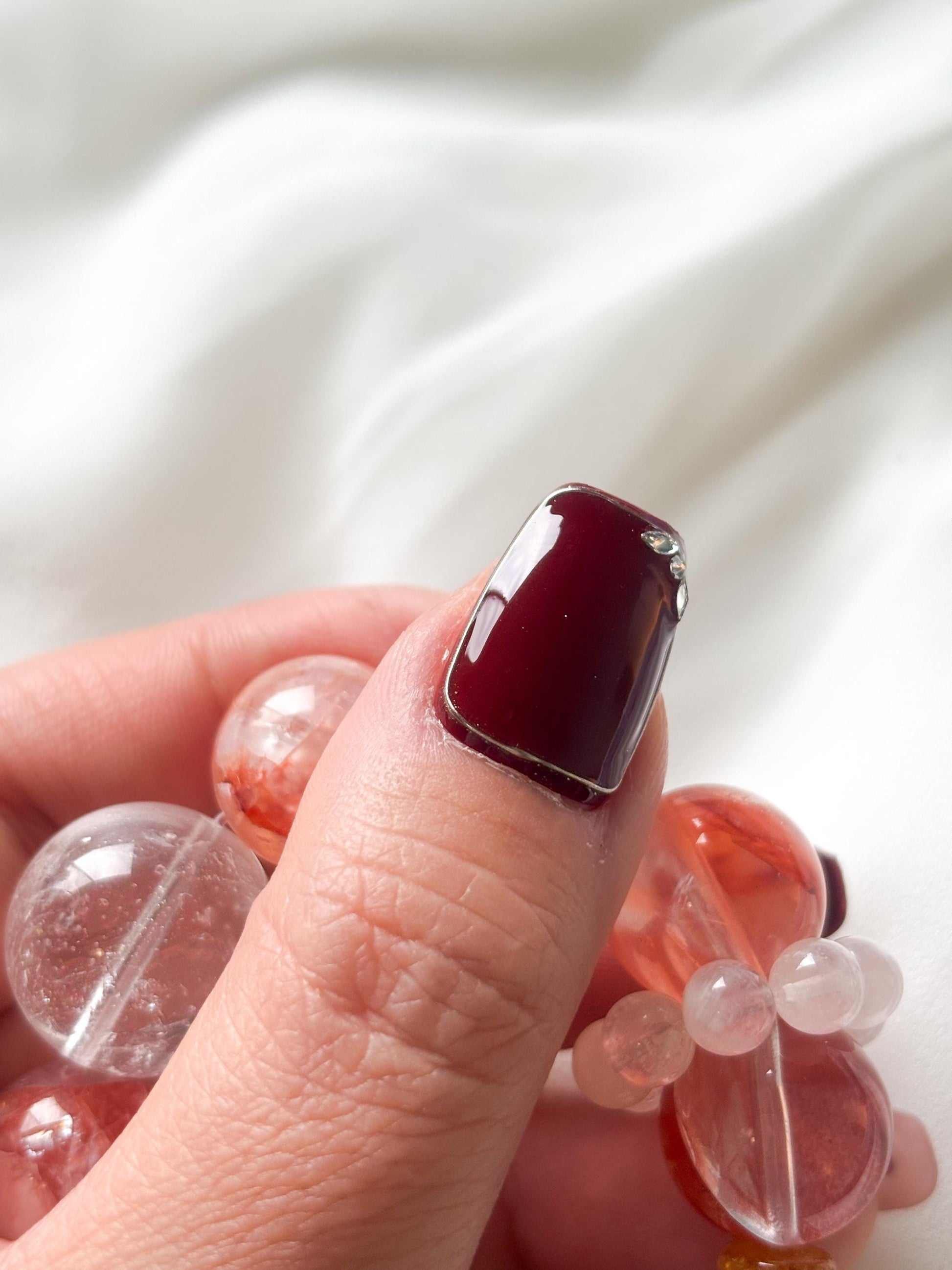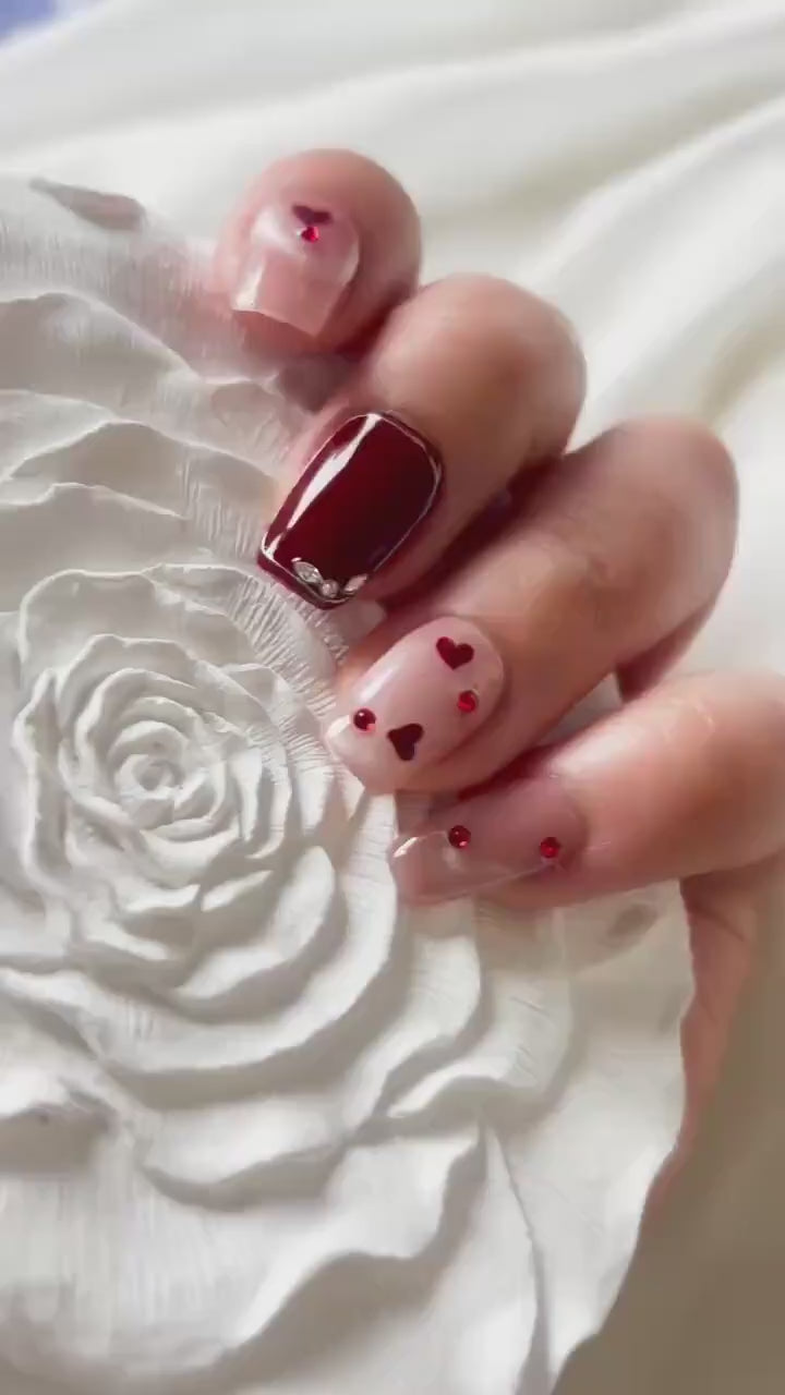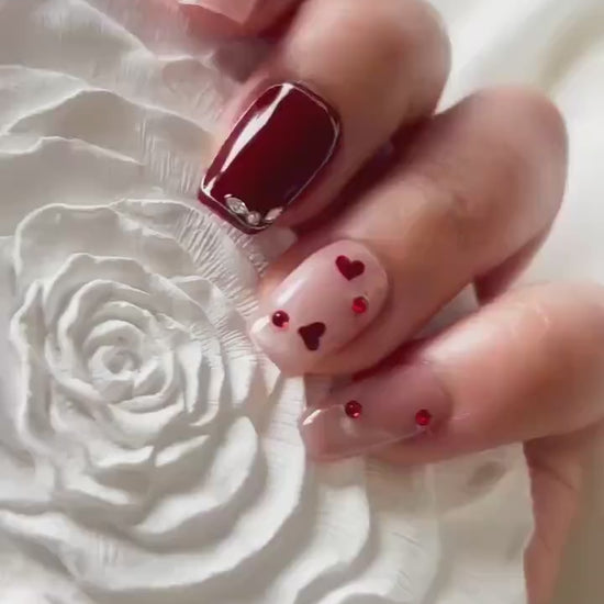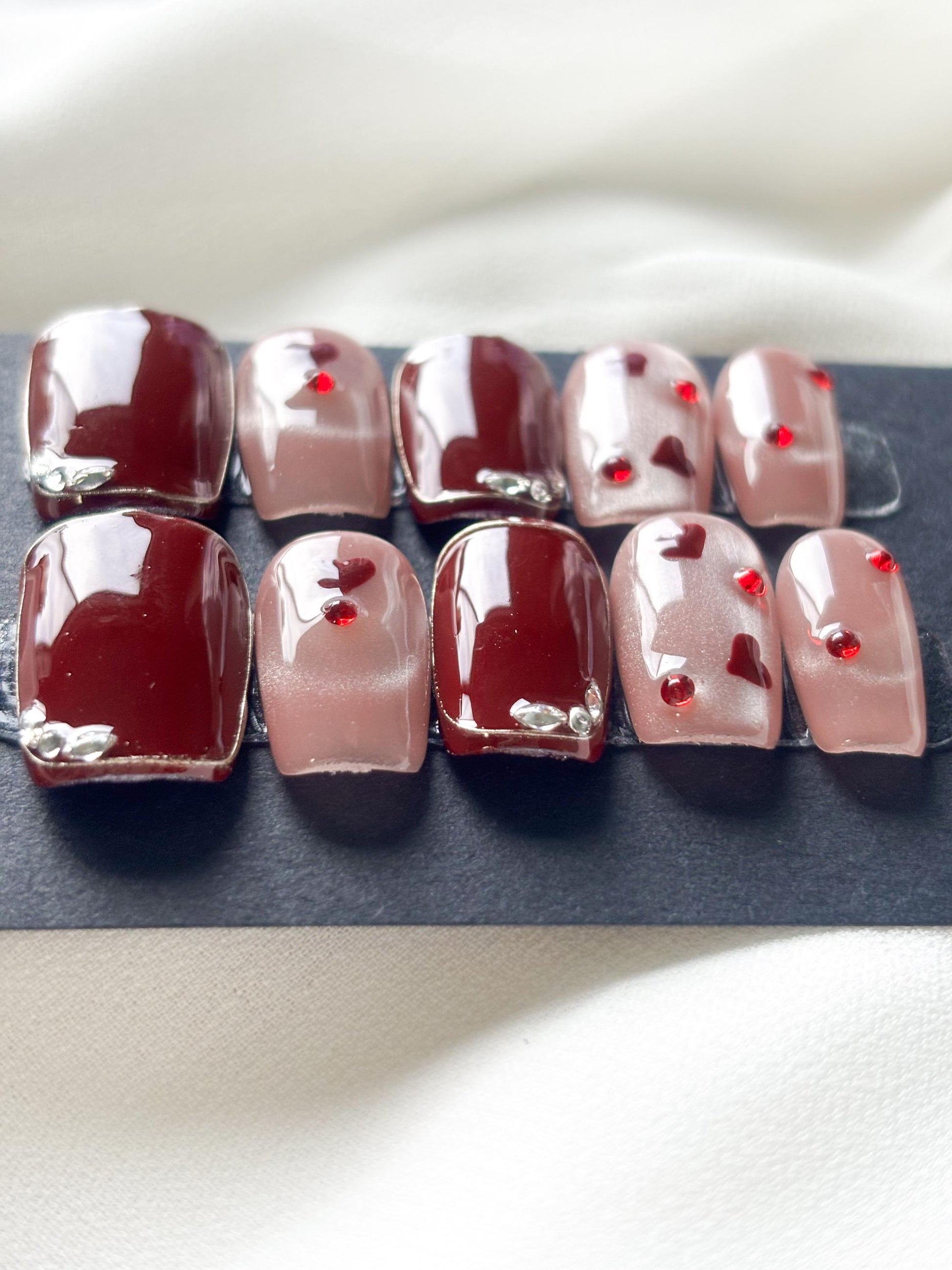 Crimson Crush – Red & Pink Press-On Nails with Zircons and Cat Eye Hearts | Valentine Vibe Glam Nails