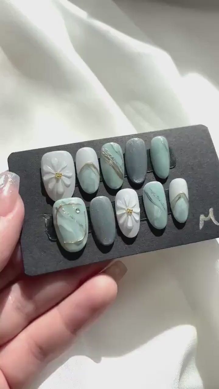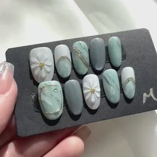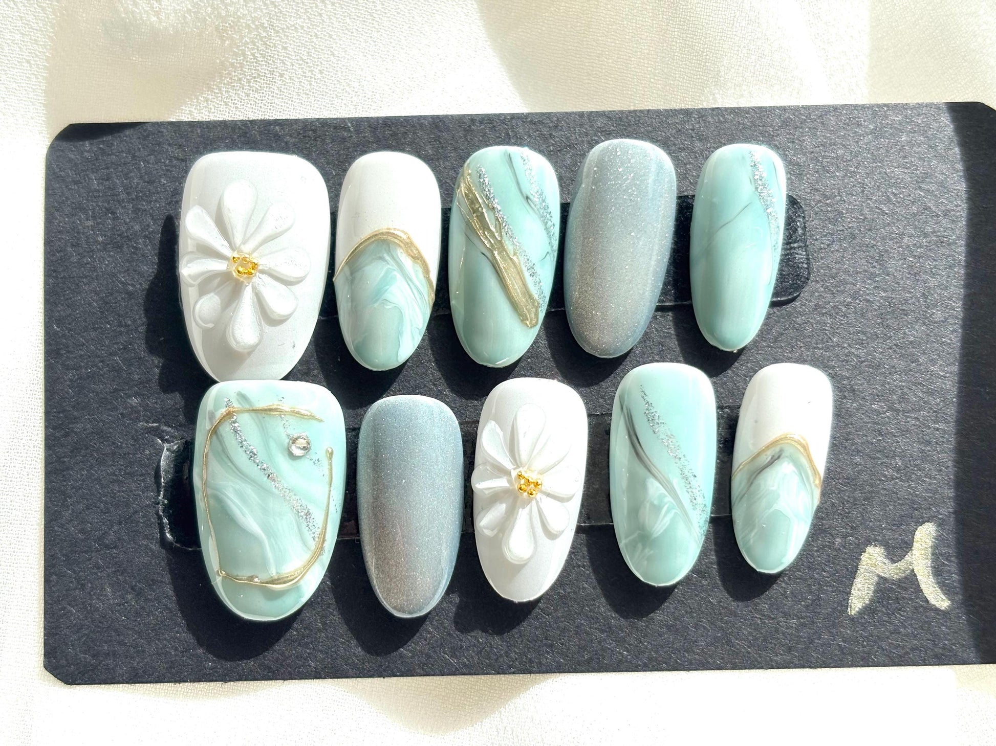 Daisy Bloom Mint Marble Press-On Nail ( S, M available )