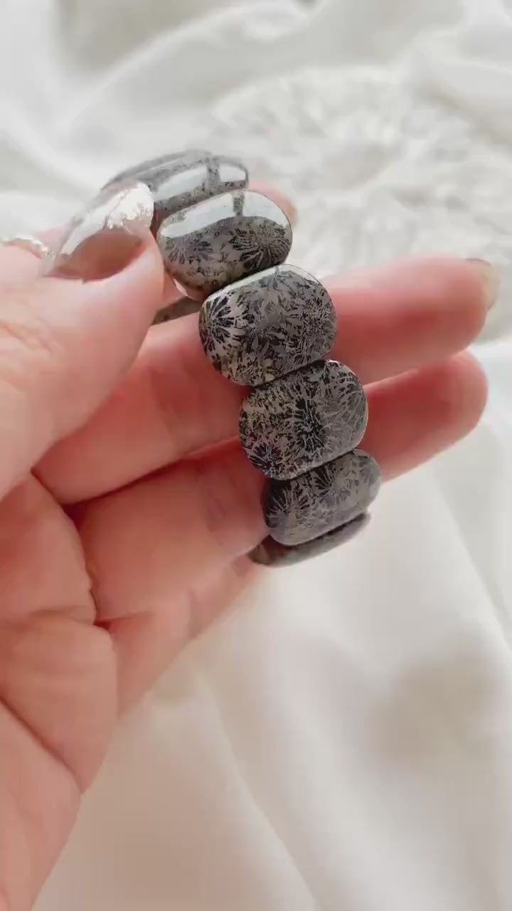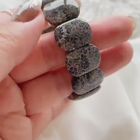 Earth’s Timeless Bloom – Charcoal Fossil Coral Daisy Bracelet
