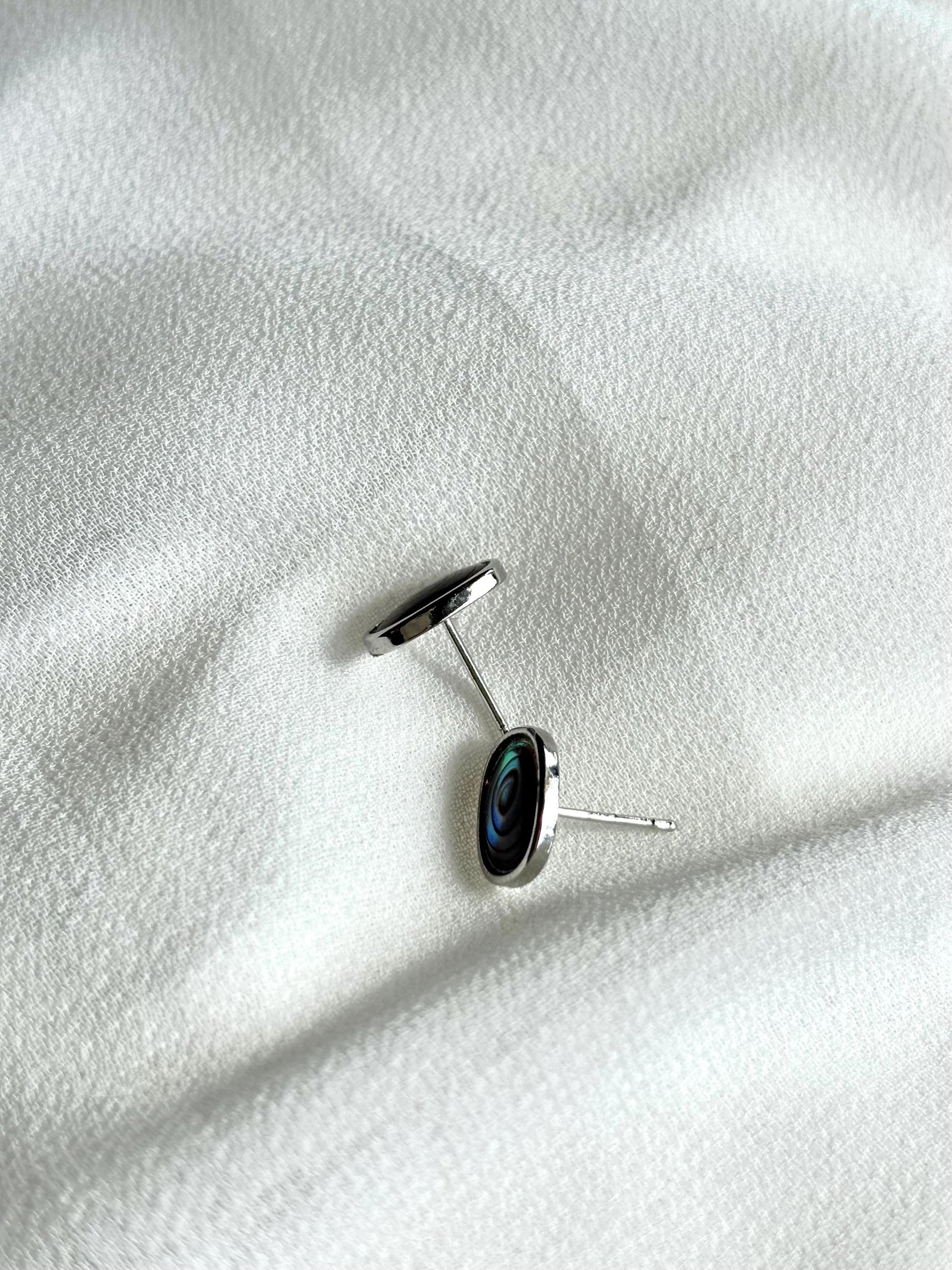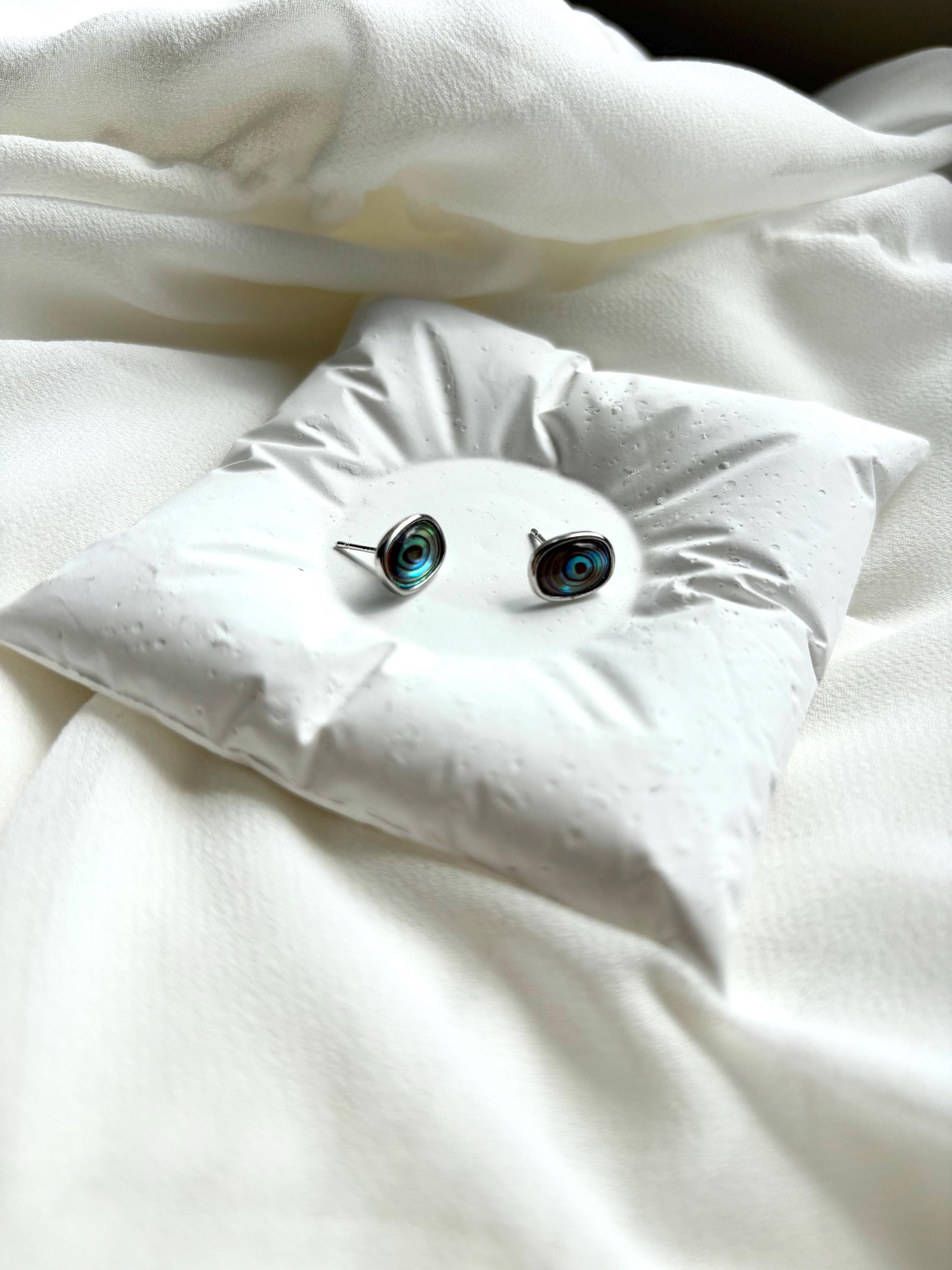 Elegant Mother-of-Pearl Studs with Black, Blue, Green Hues, and Spiral Pattern – Sterling Silver Wire