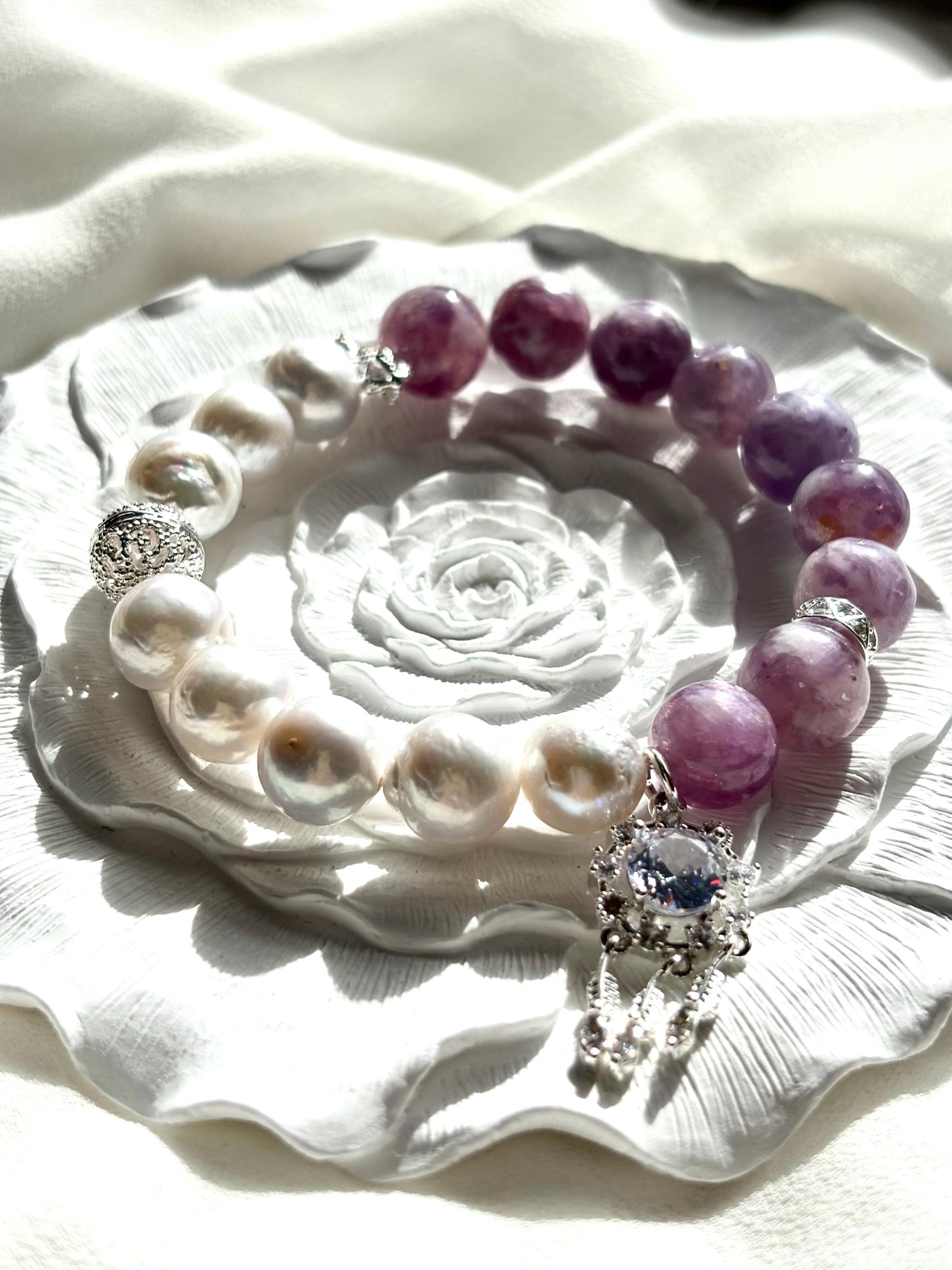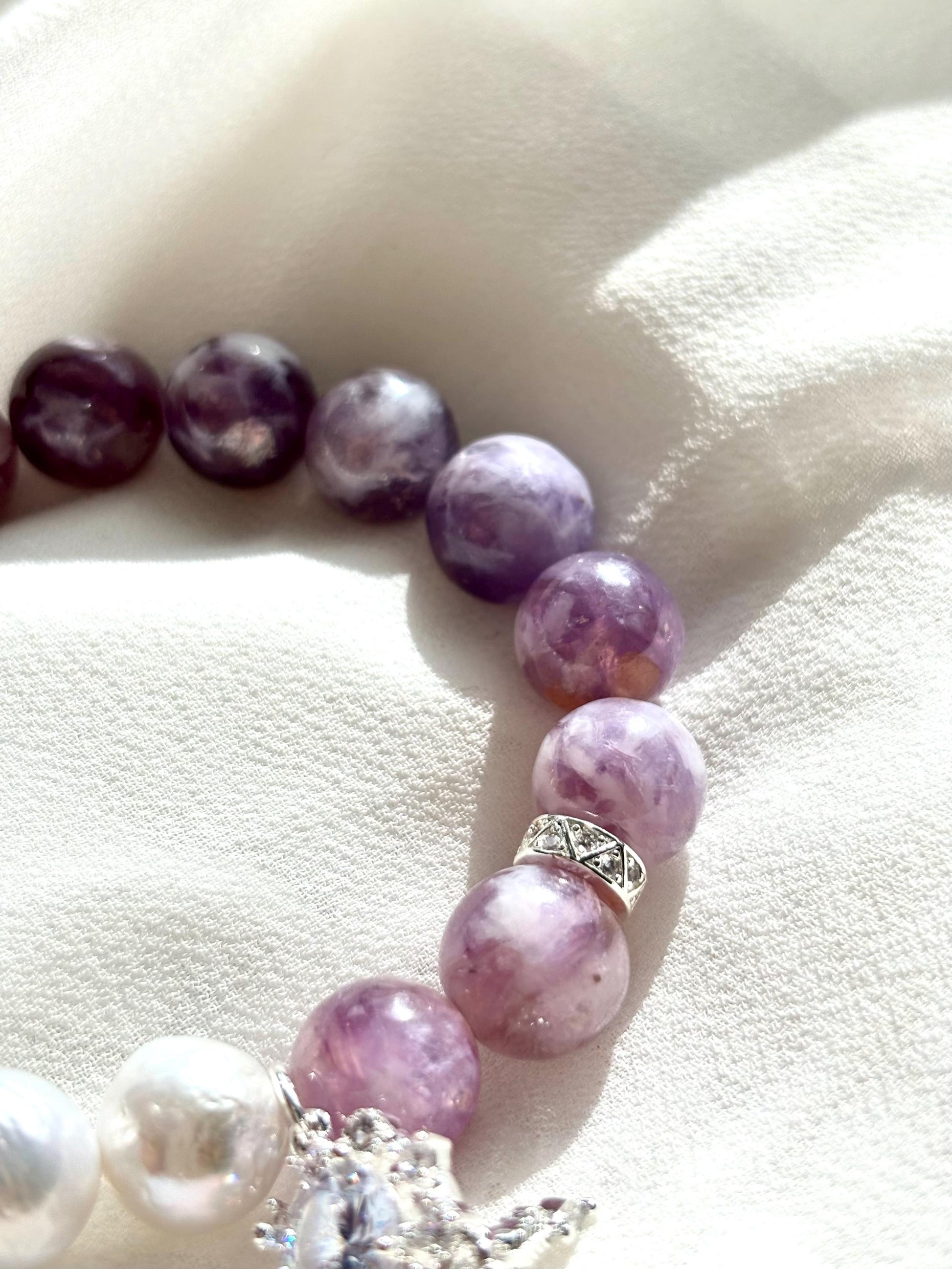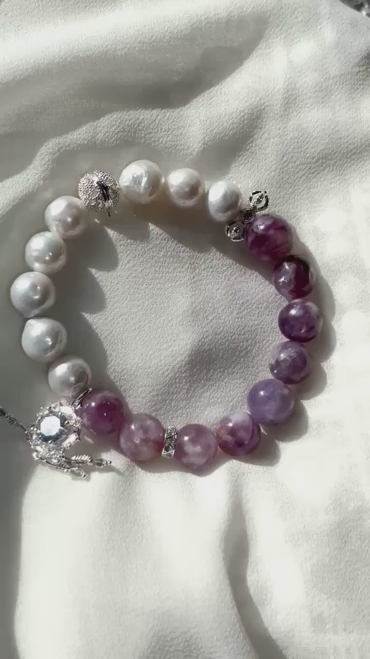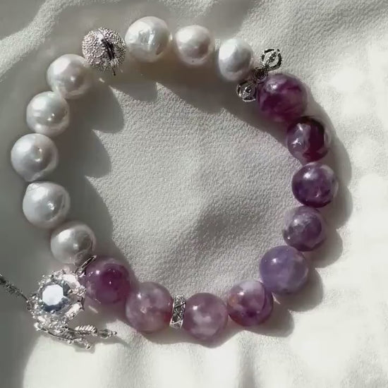 Elegant White Pearl & Milky Amethyst Bracelet with Dreamcatcher Sparkle Accents
