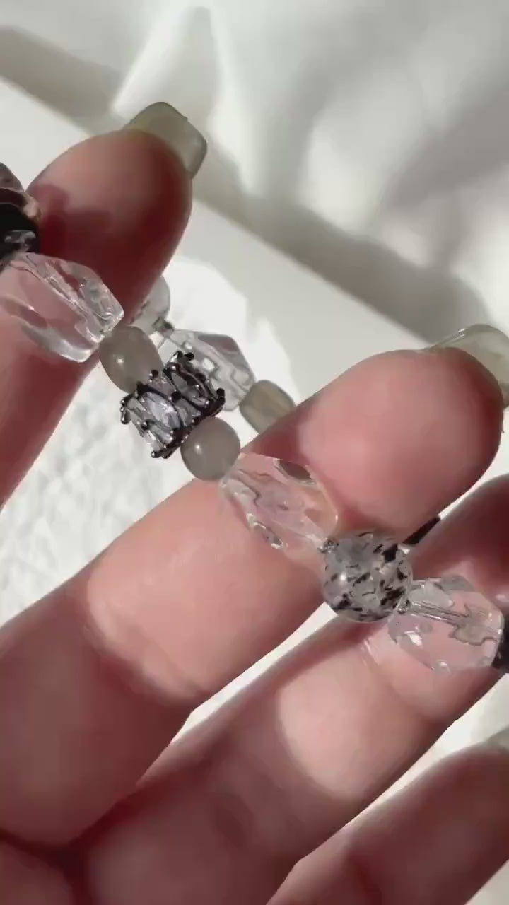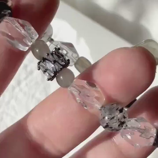 Ethereal Shadows Bracelet – Natural Grey Moonstone, Clear Quartz, Black Pearl, Biotite and Smoky Quartz