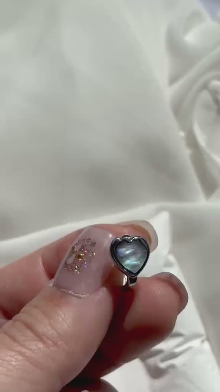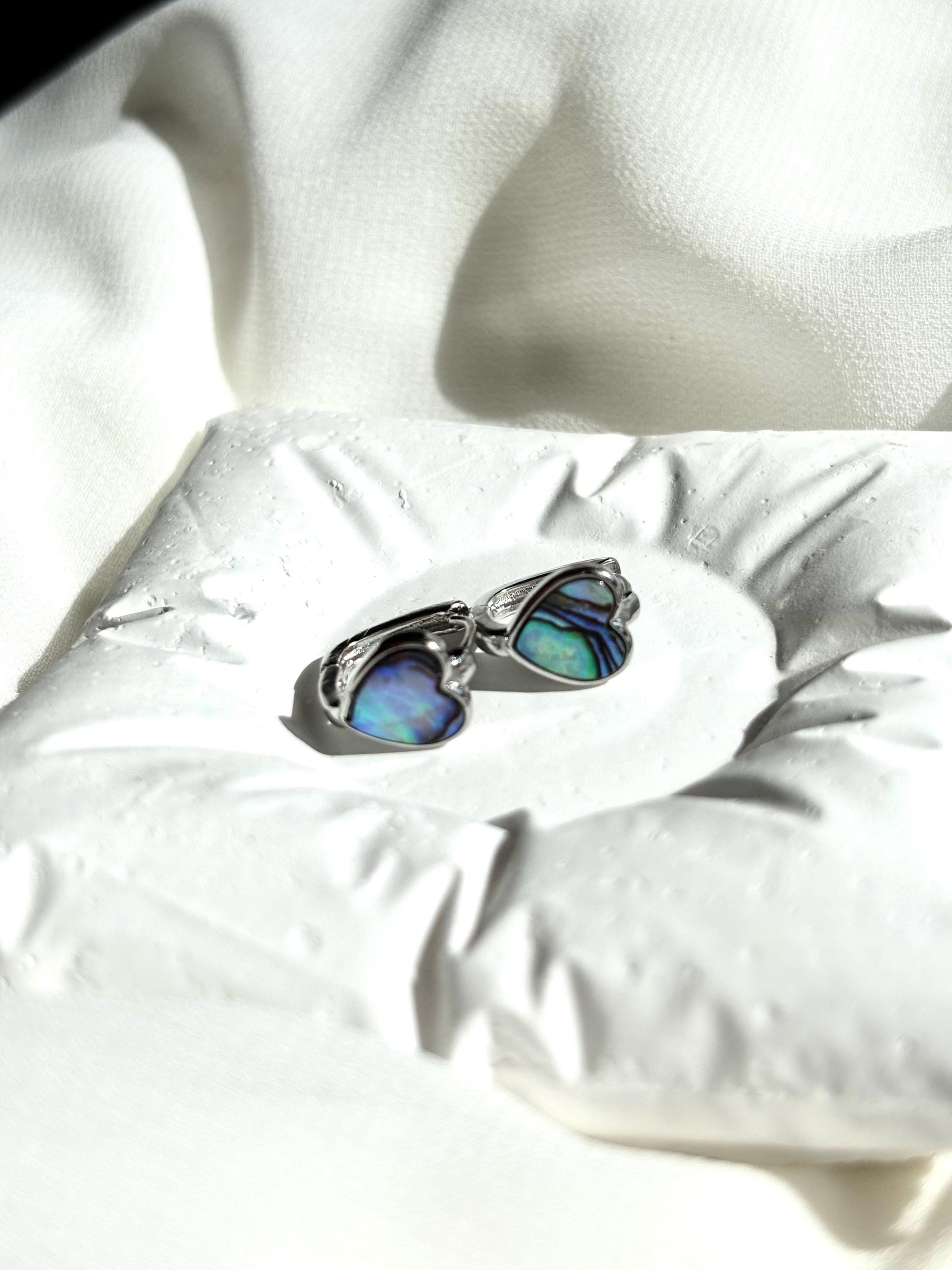 Heart-Shaped Mother of Pearl Huggie Earrings with Black and Blue Hues – Sterling Silver Wire