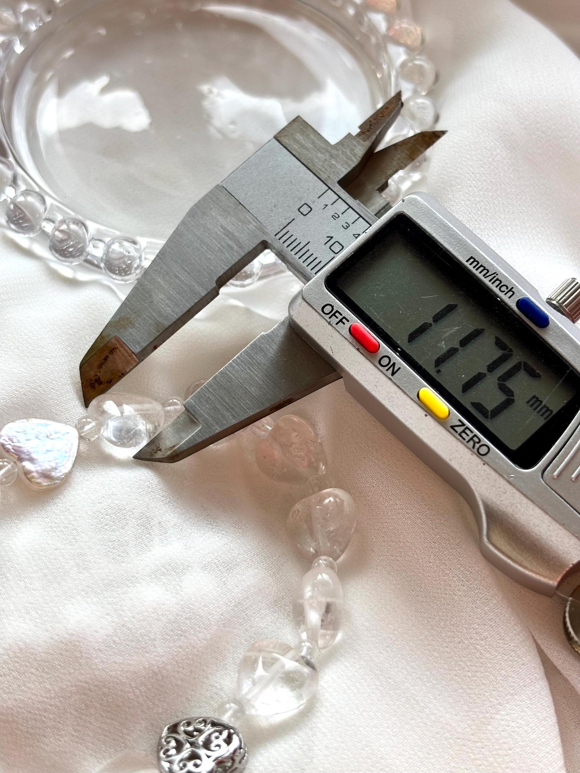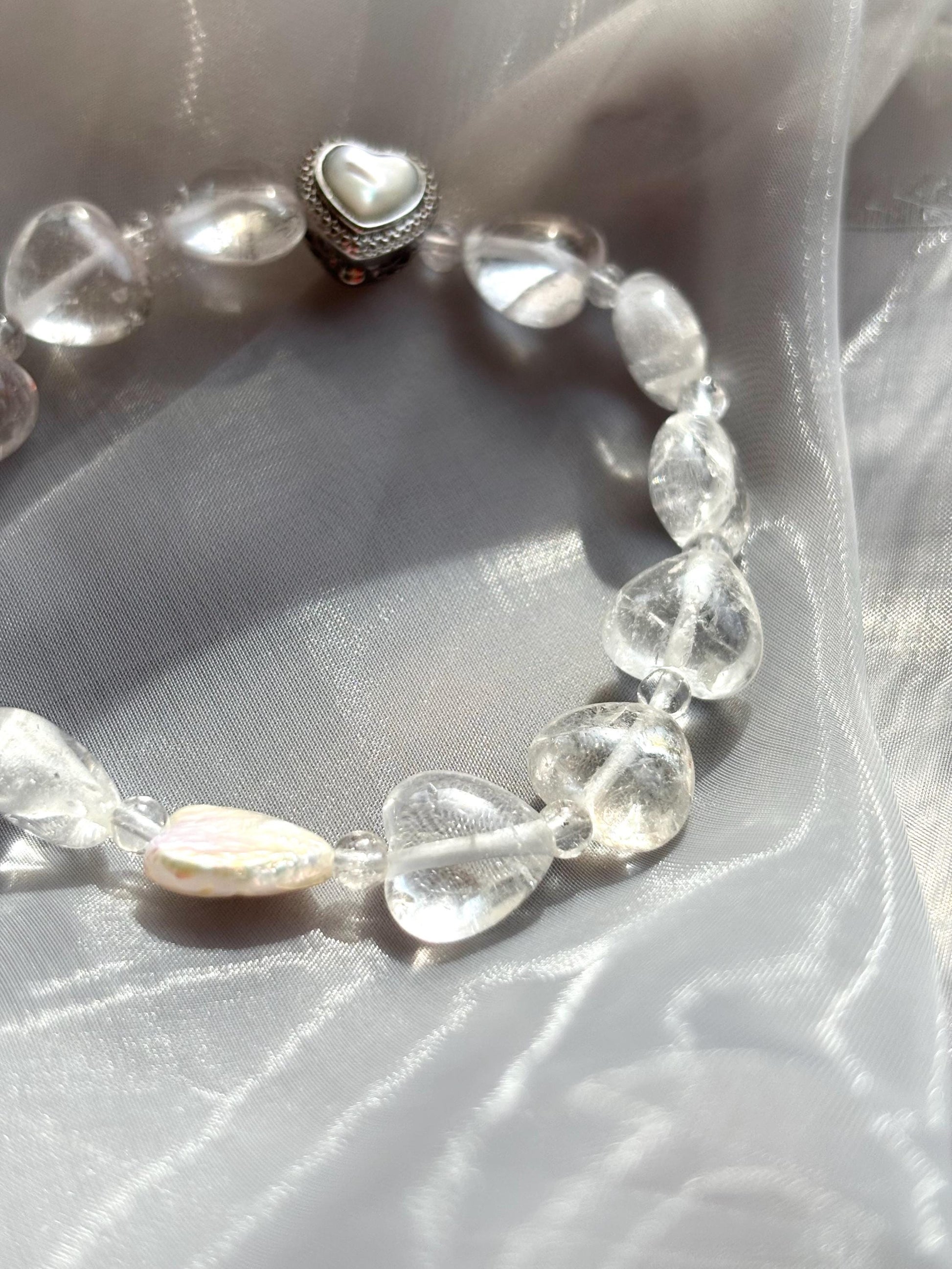 Icy Heart Clear Quartz Bracelet with Heart-Shaped Beads, Pearl, and Mother of Pearl Accents.