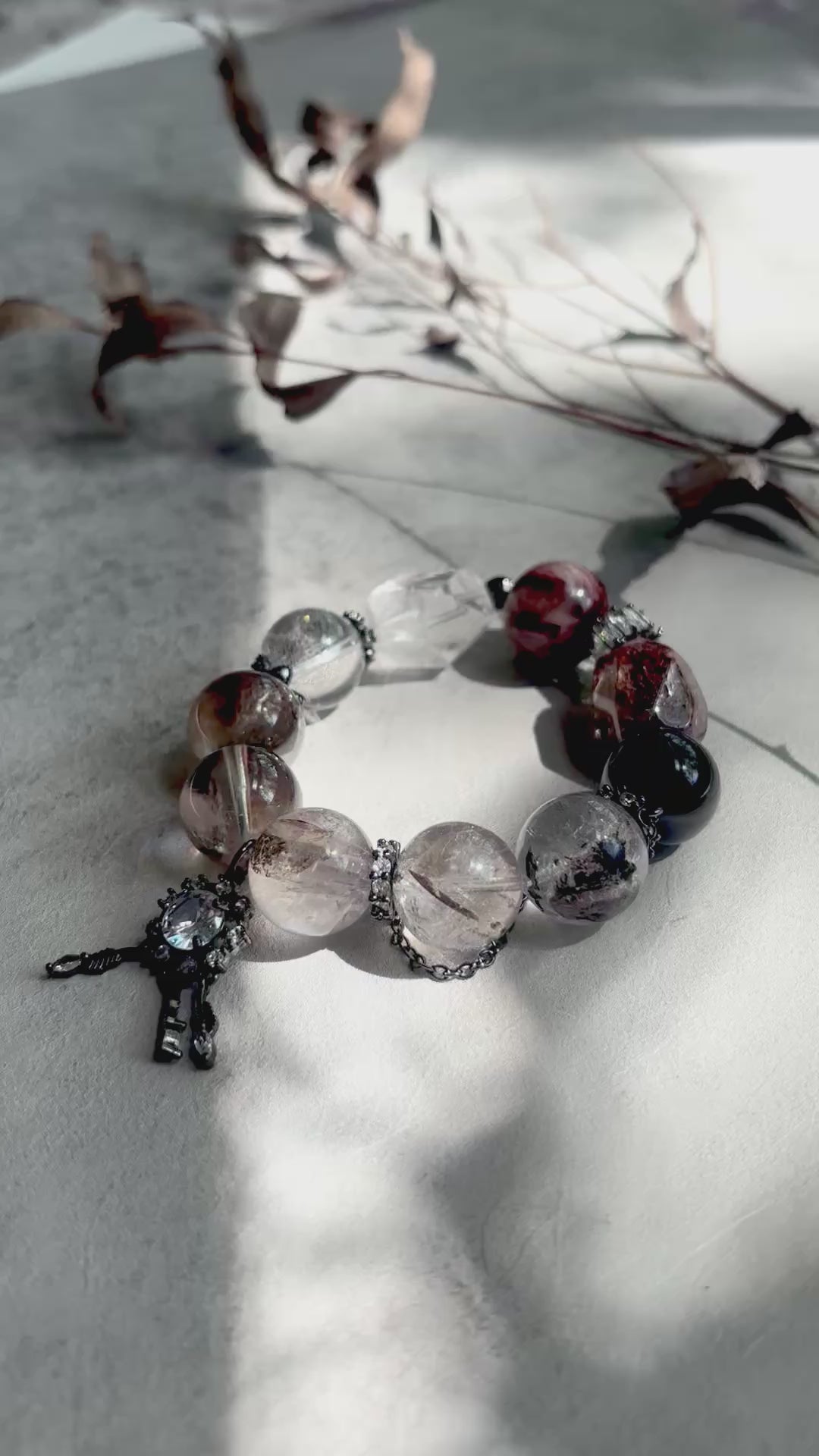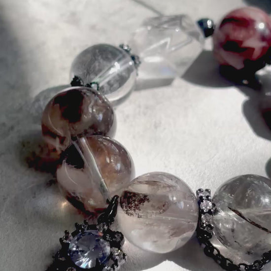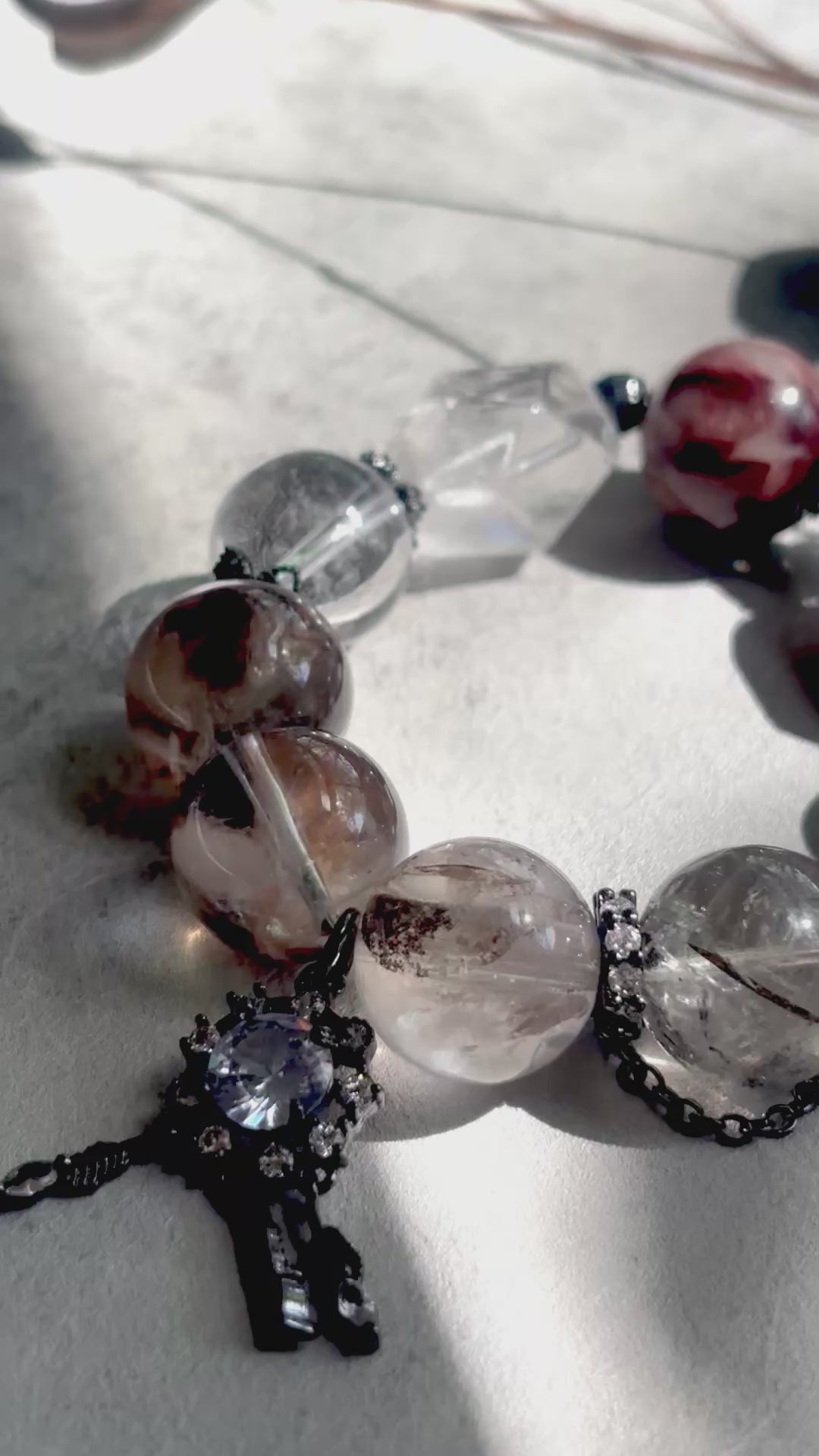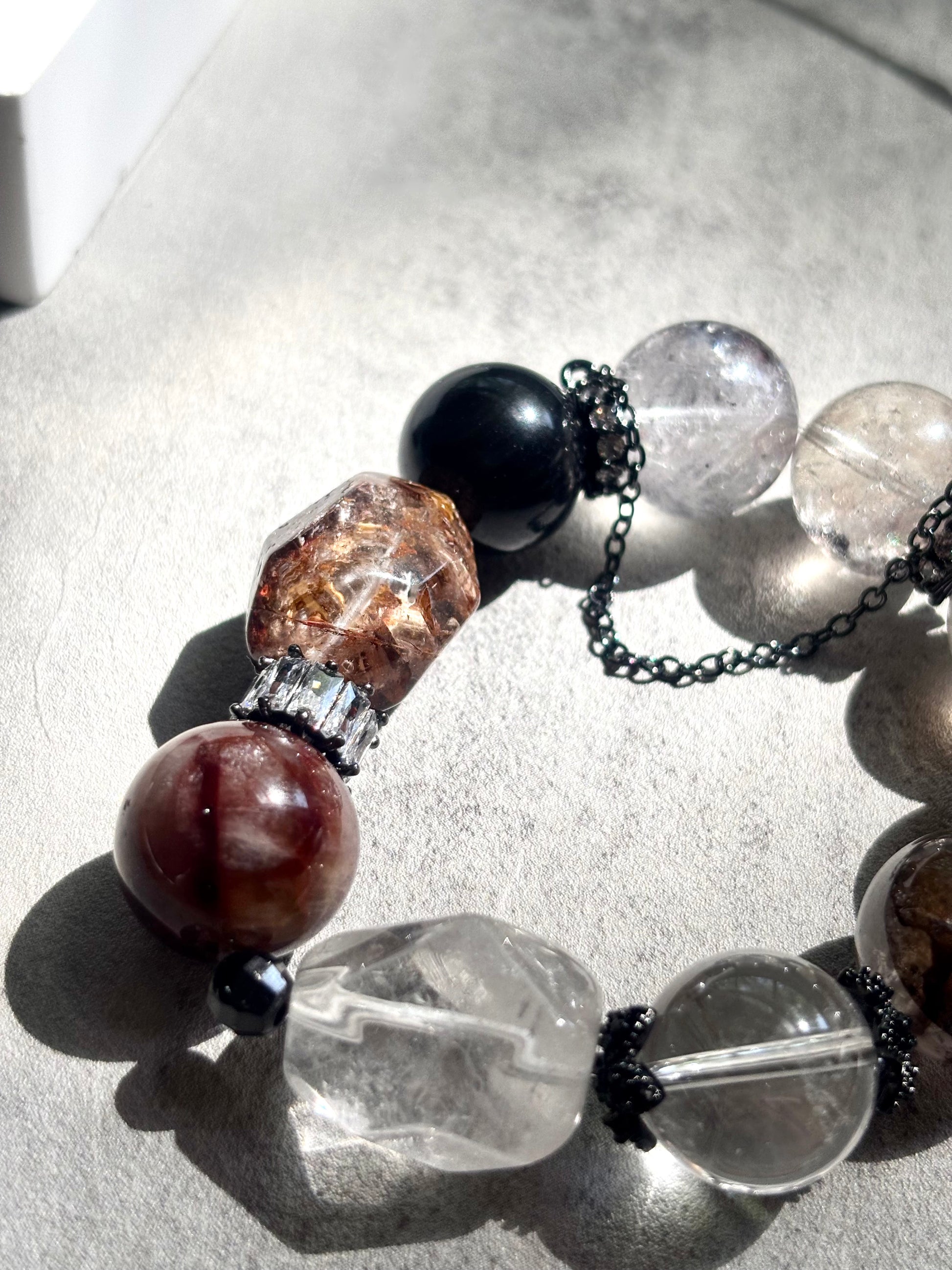Elegant and mysterious, the Ink bracelet is a stunning symphony of clarity and depth. Handcrafted with premium clear quartz, various phantom quartz, Herkimer Diamond, and biotite inclusions, each bead reveals unique inner landscapes—like swirling clouds suspended in crystal. Its design evokes the tranquil allure of ink drifting through water, balancing transparency and shadow.