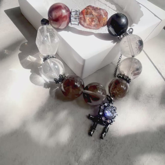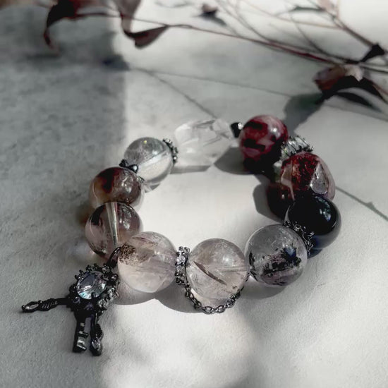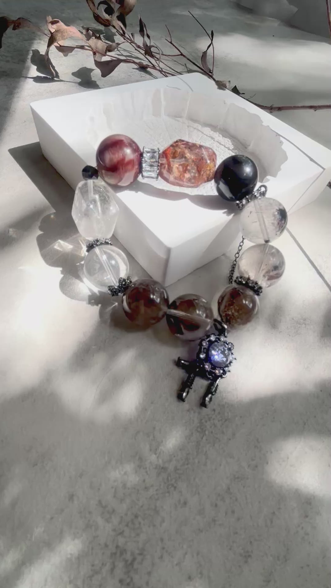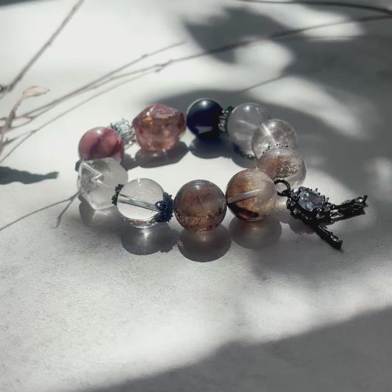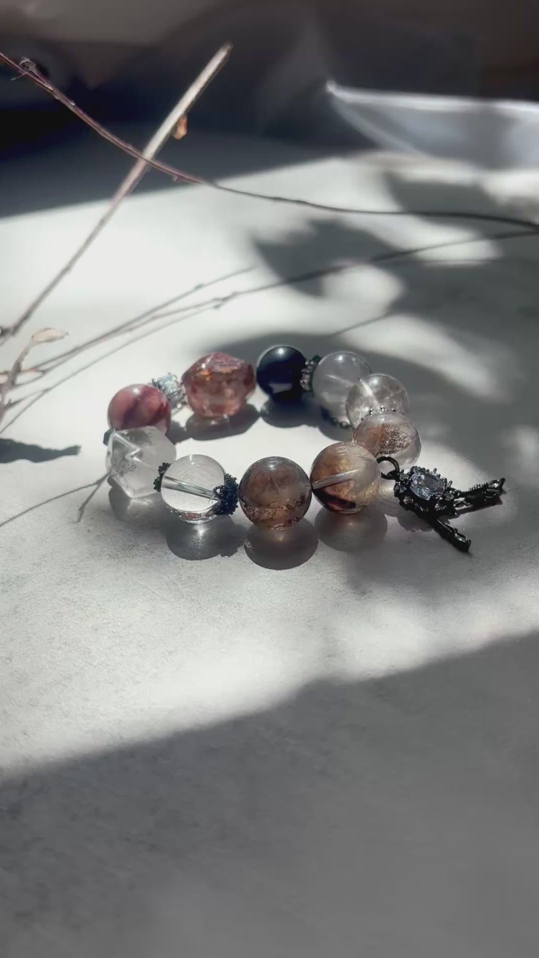 Elegant and mysterious, the Ink bracelet is a stunning symphony of clarity and depth. Handcrafted with premium clear quartz, various phantom quartz, Herkimer Diamond, and biotite inclusions, each bead reveals unique inner landscapes—like swirling clouds suspended in crystal. Its design evokes the tranquil allure of ink drifting through water, balancing transparency and shadow.