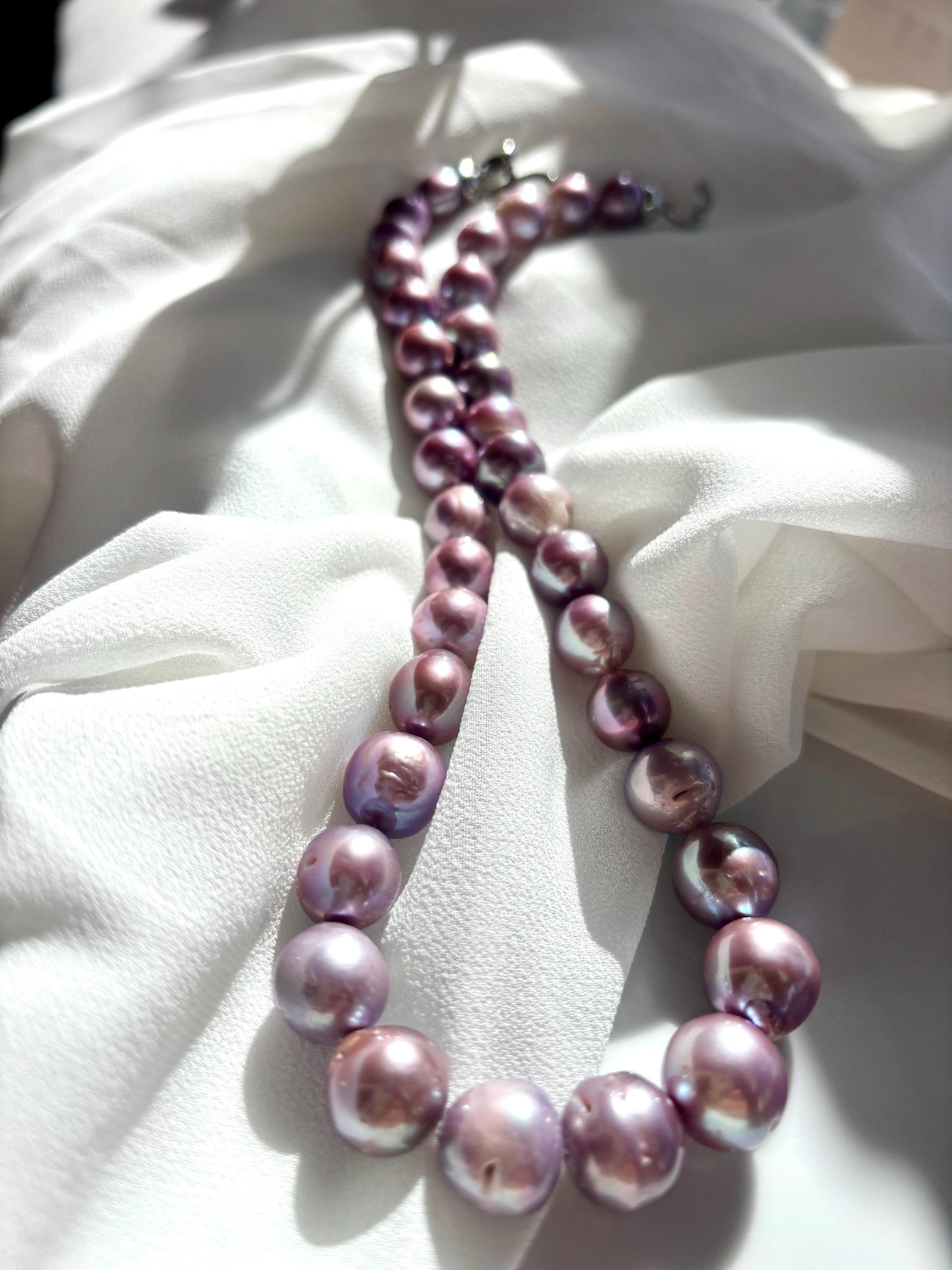 Like twilight waves kissed by fading light, the Lavender Tide Baroque Pearl Necklace shimmers with hues of coral lavender and violet mist.