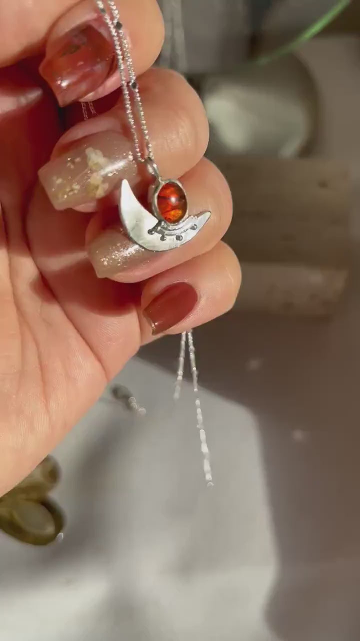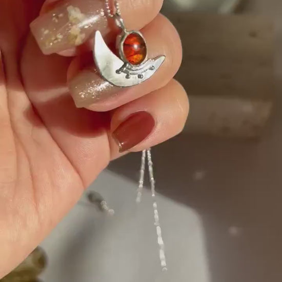 Moon and starts inspired natural amber 925 sterling silver pendent necklace
