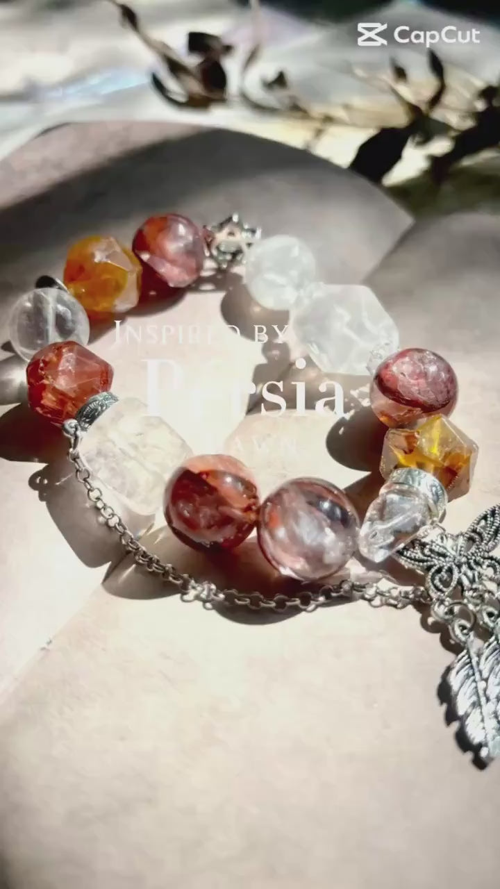 Each bead—clear quartz, golden healer, fire quartz, and white phantom quartz—is carefully chosen to echo the soft radiance of an early sunrise over desert sands. In centuries past, these stones were treasured as messengers between heaven and earth, said to hold the power to awaken intuition, protect the soul, and guide one toward their destiny.