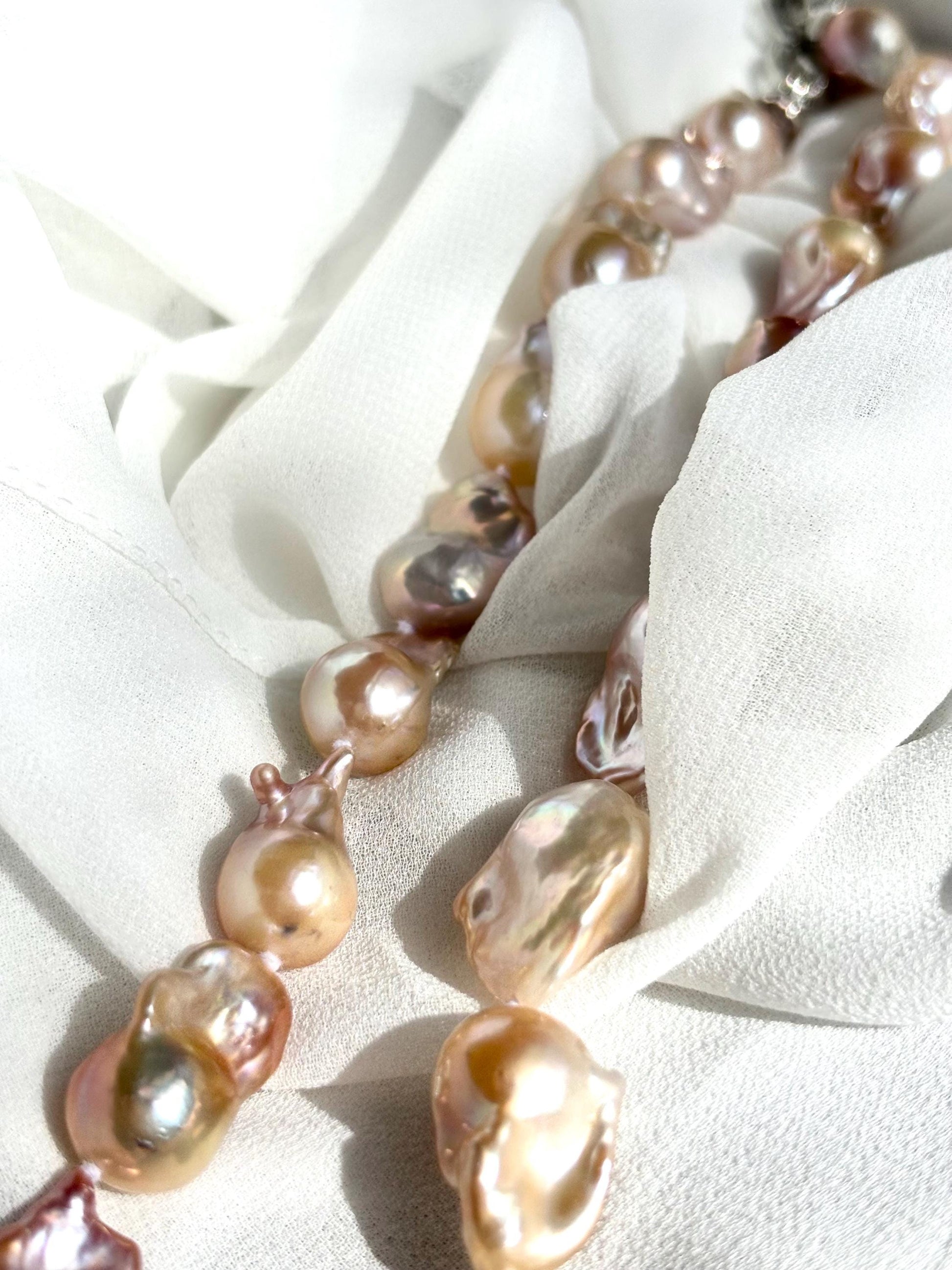 Like a spring garden bathed in morning light, the Persian Buttercup necklace glows with gentle shades of blush pink and peach. Each baroque pearl is uniquely sculpted, like petals unfurling—organic, fluid, and full of quiet elegance.