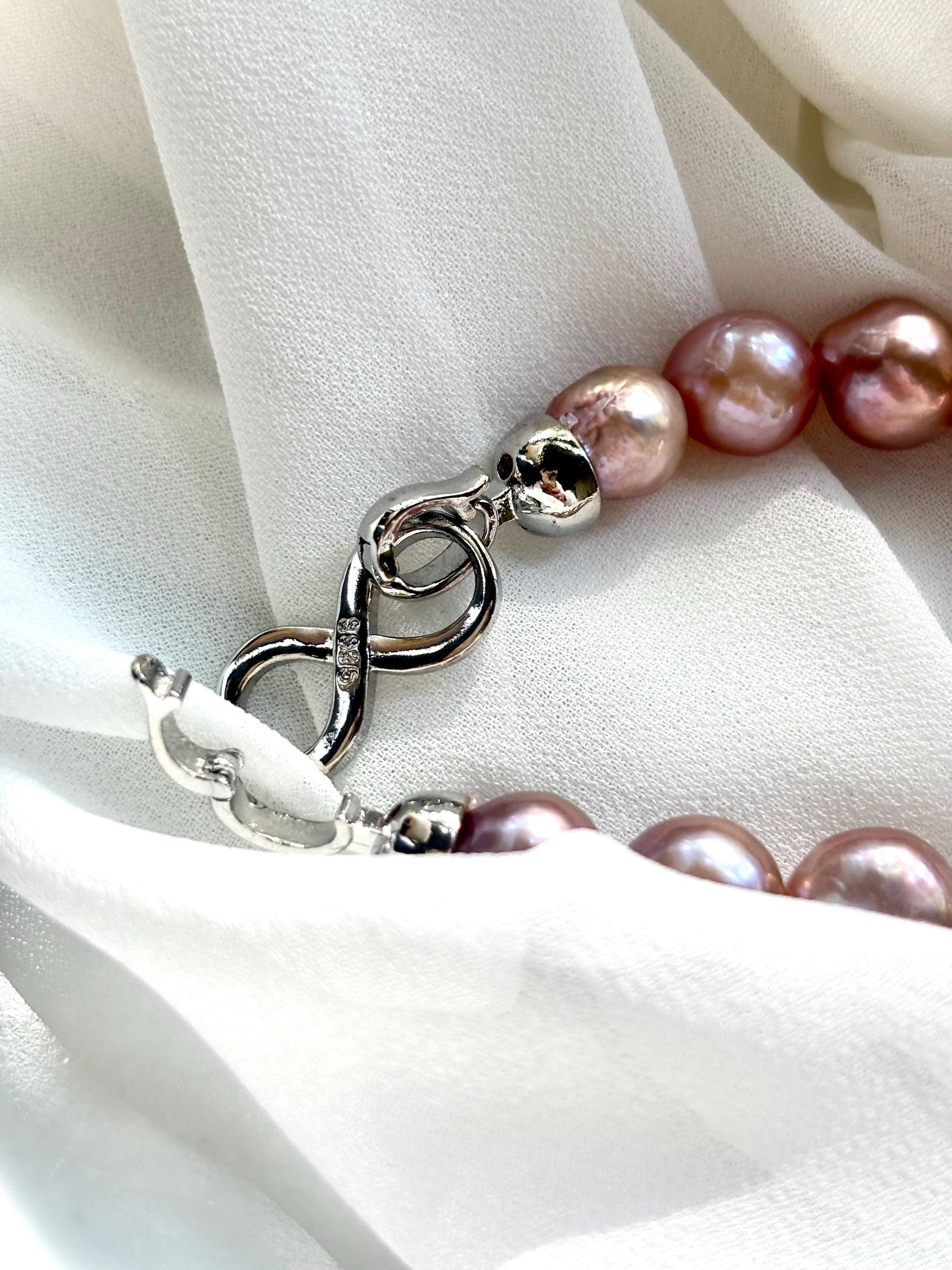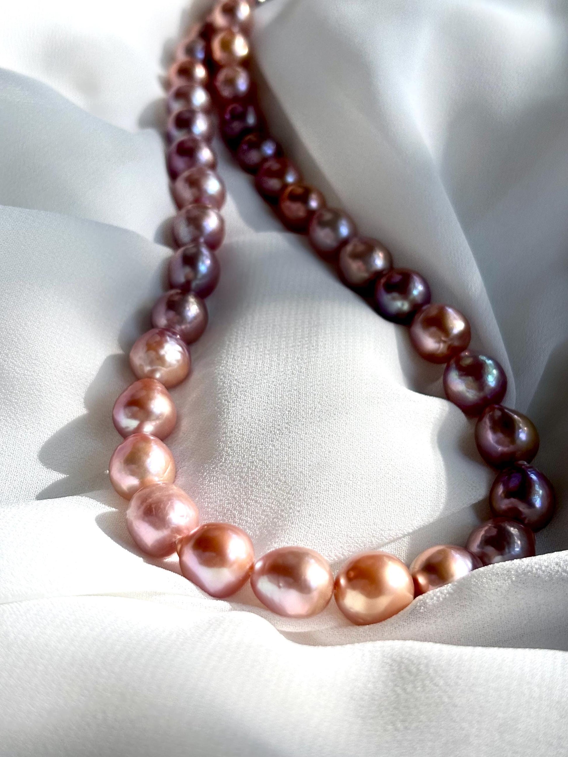 Each baroque pearl carries delicate swirls of rose gold and soft lilac, like the last light of dusk caught upon calm water. Their natural curves make every strand one-of-a-kind—a tender reflection of nature's imperfect perfection.