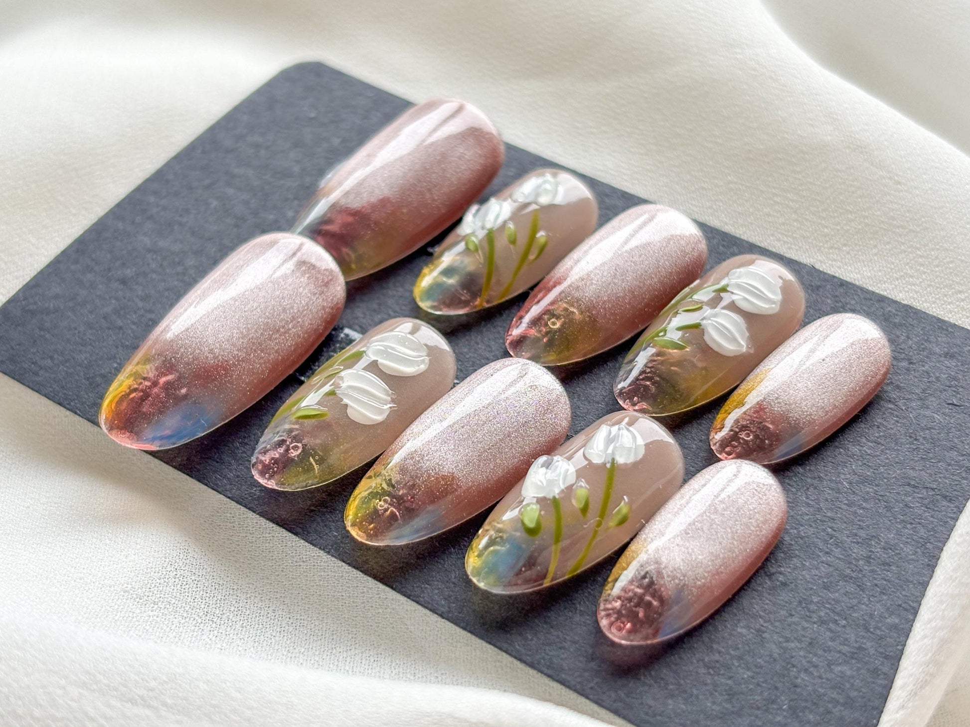 Spring Blossom Press-On Nails – Pink & White Floral with Transparent Colorful Tips