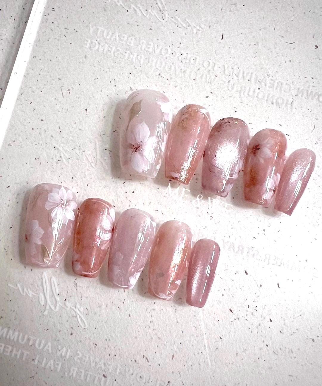 The pinkish tones and subtle white accents give the nails a playful yet refined feel. Glitter and foil touches add sparkle, while the mix of textures makes this design irresistibly charming and full of romantic allure.