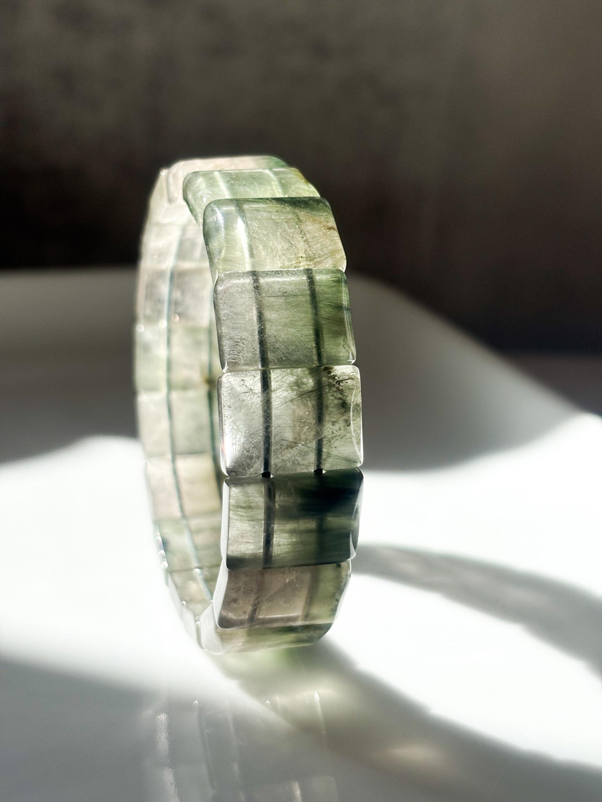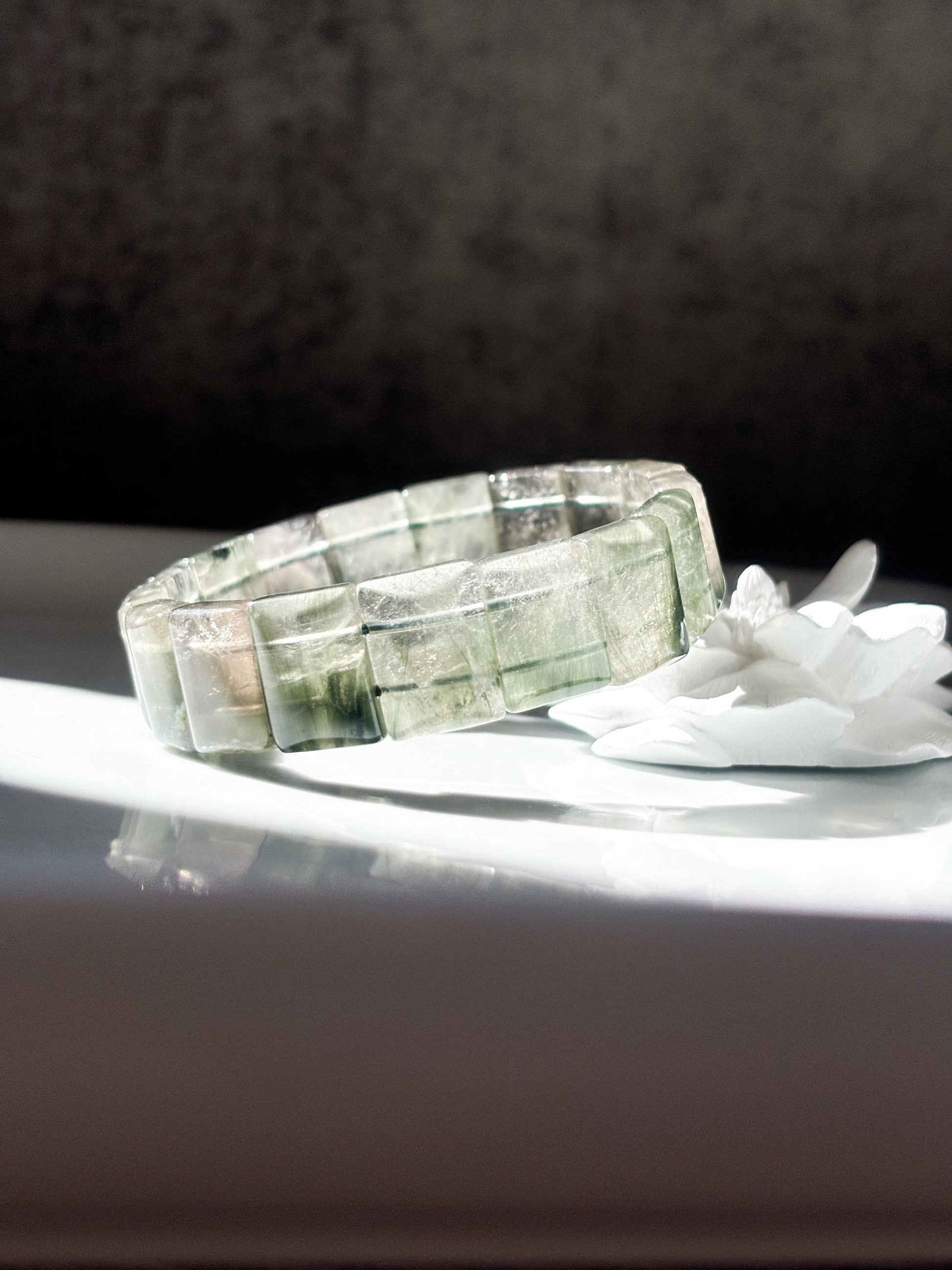 When light touches its surface, the quartz reveals delicate green needles that seem to move like ferns swaying in a hidden grove. It's more than a piece of jewelry—it's a small piece of nature, wrapped gently around your wrist, reminding you to breathe, slow down, and listen to the world's softer sounds.